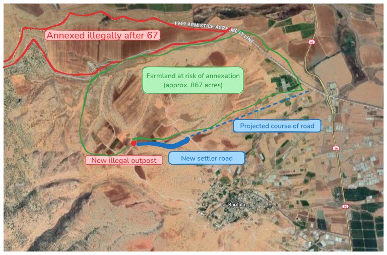 According to Younis Tirawi, at the end of December 2024, an outpost appeared, close to Palestinian-owned private land, and constructions for a road to connect it to the main road are done daily on palestinian private land. This new illegal outpost is stealing the town's lands and making the residents' life insufferable. One of the settlers is Eitan Ze'ev, known for shooting Palestinians. Since then, every time the residents tried to access their fields, they were met with a combined settler-soldier militia that physically assaulted them, threw gas bombs at them, and kidnapped a few Palestinian farmers to a nearby military base for a few hours of detention. Since the outpost was established, army and settler invasions to Bardala increased, and one time settlers accompanied by army forces even invaded Bardala's school, assaulted people and shot live fire.