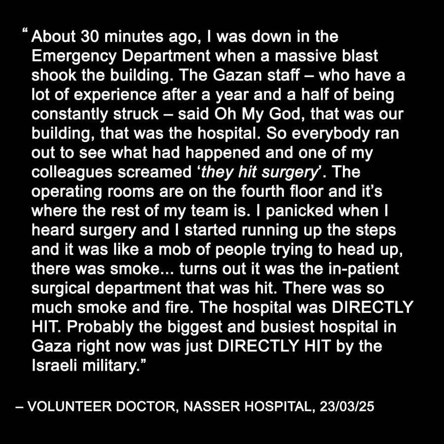 Around 9:10 pm, an Israeli airstrike directly struck Nasser Medical Complex in Khan Younis, the main hospital that remains functioning in southern Gaza.