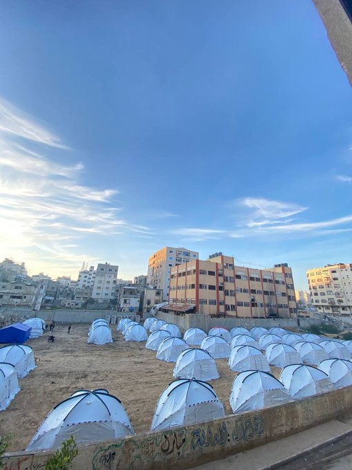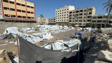 Early afternoon, an Israeli airstrike targeted the Al-Israa camp for displaced Palestinians, located next to Al-Israa Tower and Al-Mostaqbal Model Private School, on Omar Al-Mukhtar Street, Gaza City.