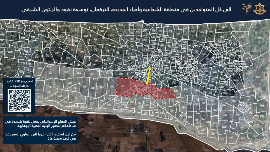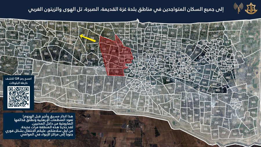 Around 9:30 am, the IDF issues a new forced displacement order covering Al-Shujaiya neighborhood in addition to other areas in eastern Gaza City.