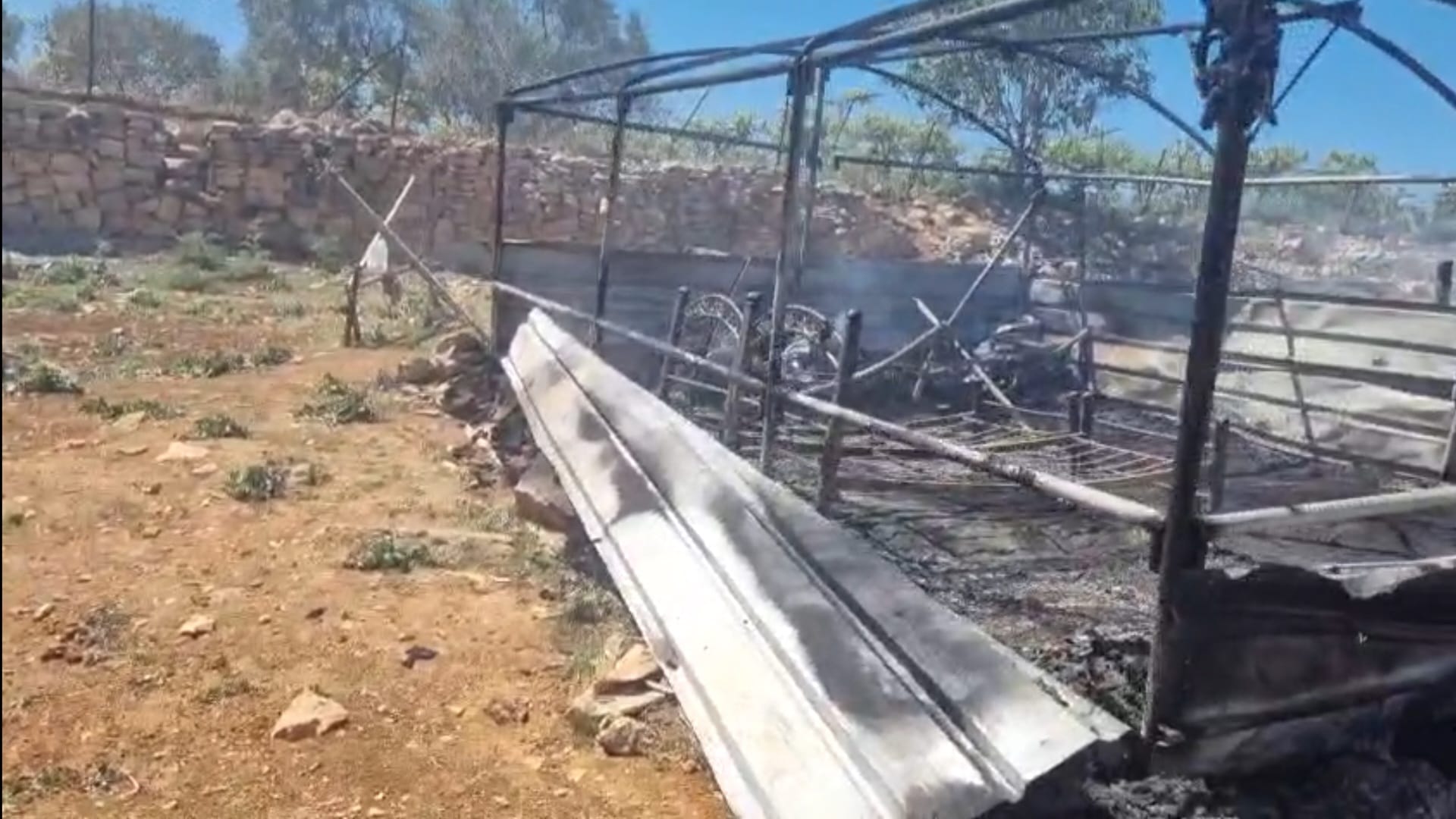 On April 21 2025, dozens of settlers coming from the direction of a new illegal outpost established during the previous night on the lands of Sinjil began setting fire to agricultural structures, equipment, and residential tents of Palestinian communities.