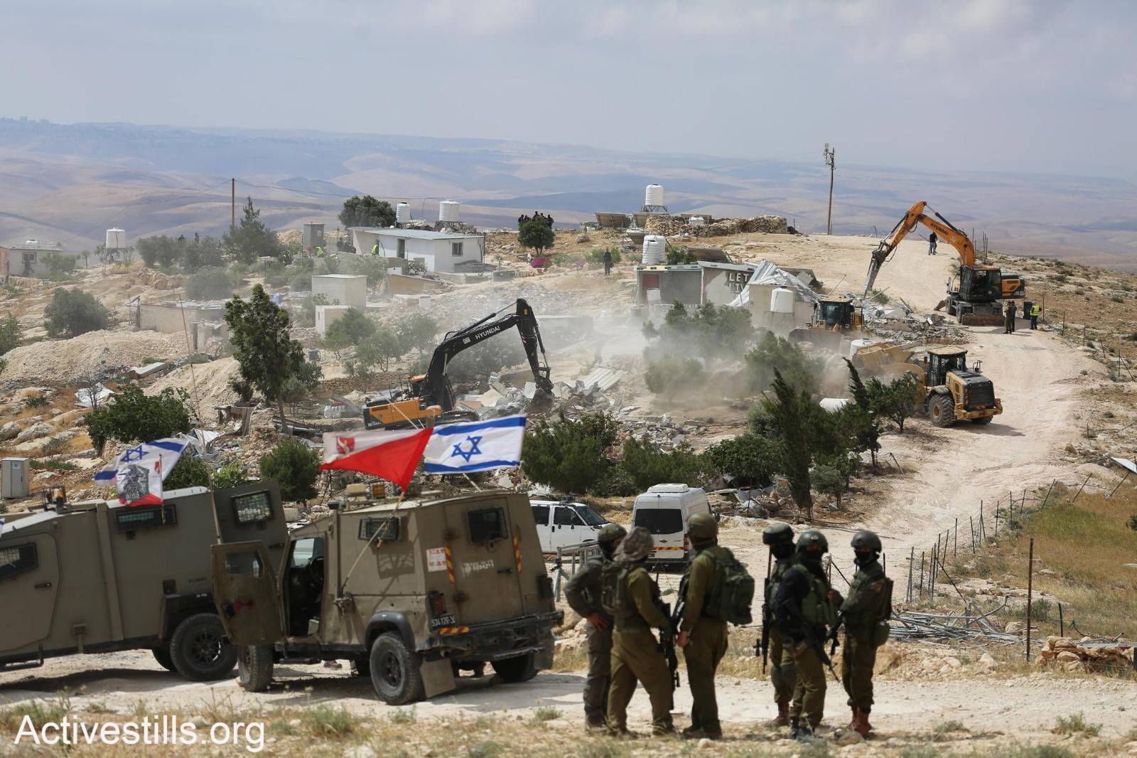 They demolished 9 homes, 6 caves, 10 water tanks, 4 animal barns, 11 toilet rooms, 7 water wells, 400 meters of agricultural fencing, the community center, the electricity room, all solar panels, internet systems, and security cameras. Only 2 or 3 houses remain standing.