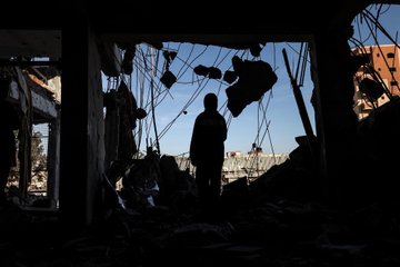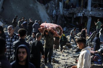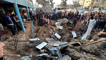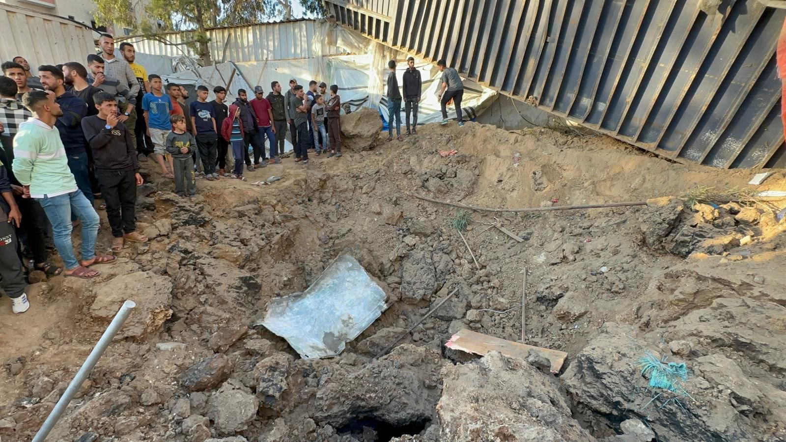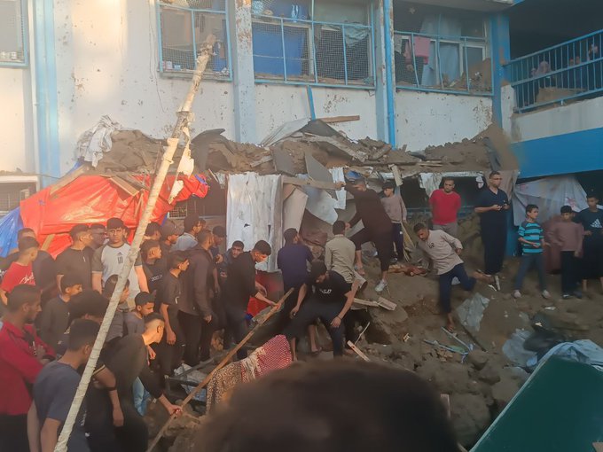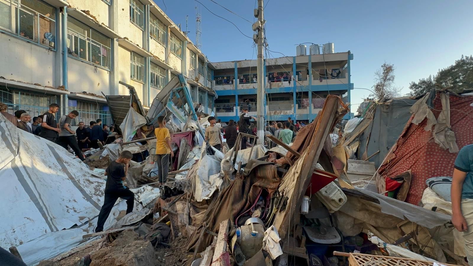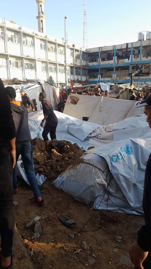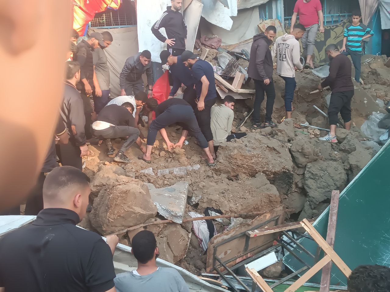 Around 6 pm, a double Israeli airstrike targeted the Abu Hamisa South School in Al-Bureij refugee camp in Central Gaza, killing around 20 people and destorying displacement tents in the courtyard.