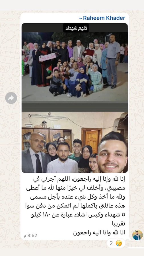 The victims are relatives of journalist Abduraheem Khader, who confirmed he was only able to bury 5 of his relatives and a 180 kg bag of body parts as all the rest were either shredded or buried under the rubble of their home.