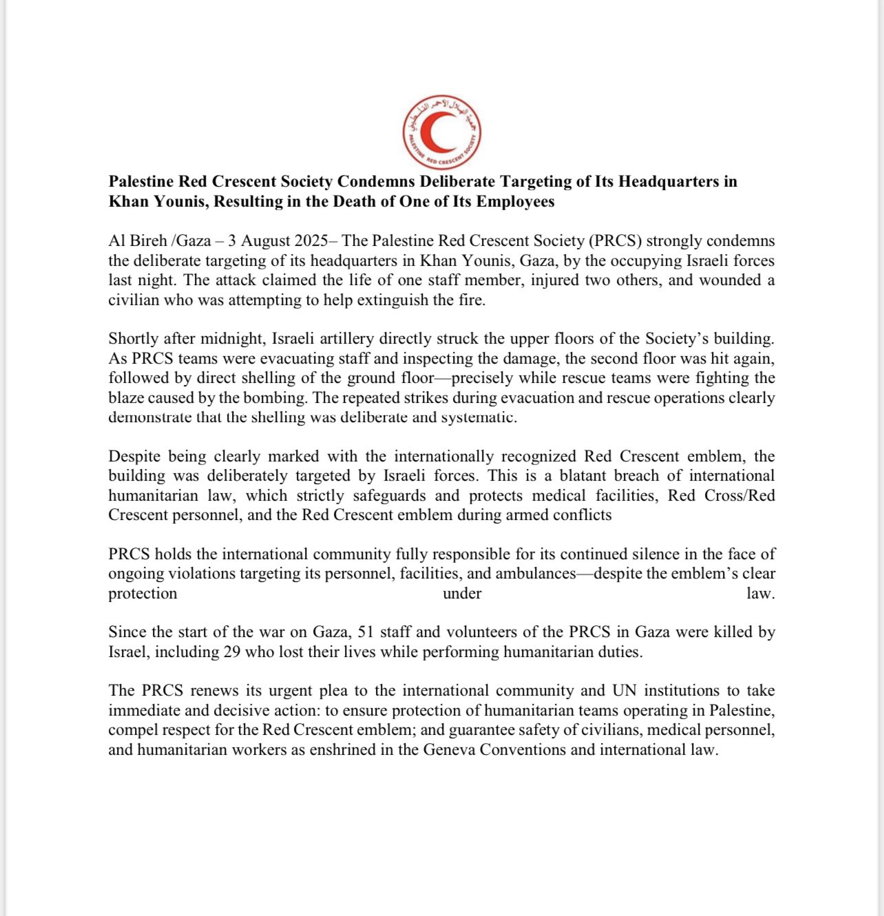 The strike killed one PRCS staff member, injured two others along with a civilian who was atempting to extinguish the fire that broke out and damaged the premises.