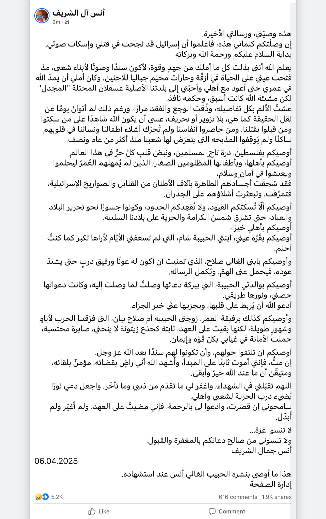 The assassination came on the anniversary of one of Israel's most gruesome massacres at Al-Tabi'in school where Anas had documented some of his most poignant reporting. Shortly after the latter, the IDF's arabic spokesperson Avichay Adraee incited against Anas, and continued to do so several times throughout the next 12 months. The IDF put Anas on a kill-list of journalists and continued inciting against Anas after his reporting on the devastating effects of Israel's starvation policy starting late July.