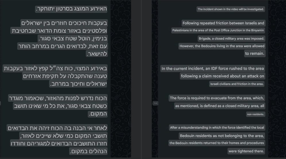 August 11, 2025 – After residents had already resigned themselves to displacement by settler militias and were preparing to leave their homes within the next couple of days, soldiers arrived in the village late at night. They declared the village a "closed military zone" and ordered the residents to leave immediately.