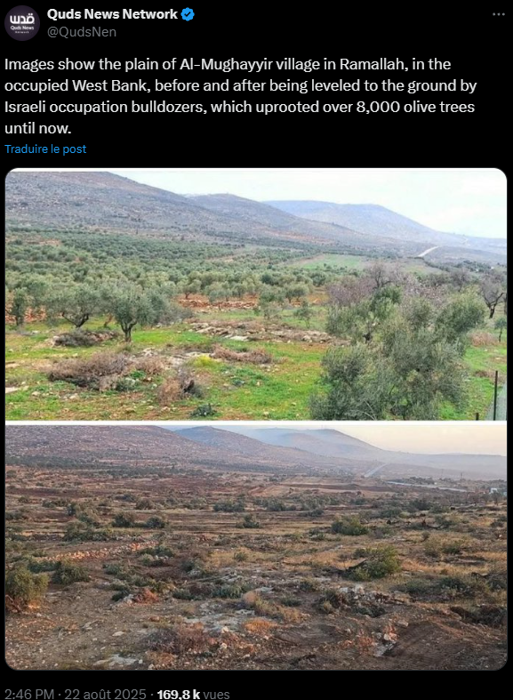 On Augustus 22, during the night and the day after, 6 excavators and at least one D9 uprooted all the hundred years old olive trees in the plain near Al-Maghayyir Abu Falah and Turmus Ayya. At least 8,000 m² of olive groves were already destroyed. Ambulances were blocked from reaching the wounded Despite the destruction, residents vowed to remain on their land. Calls were issued to Palestinian institutions, humanitarian organizations, and the international community for urgent intervention and protection. ISM (International Solidarity Movement) urged global media and human rights bodies to denounce the violence and act against what it calls crimes against humanity.