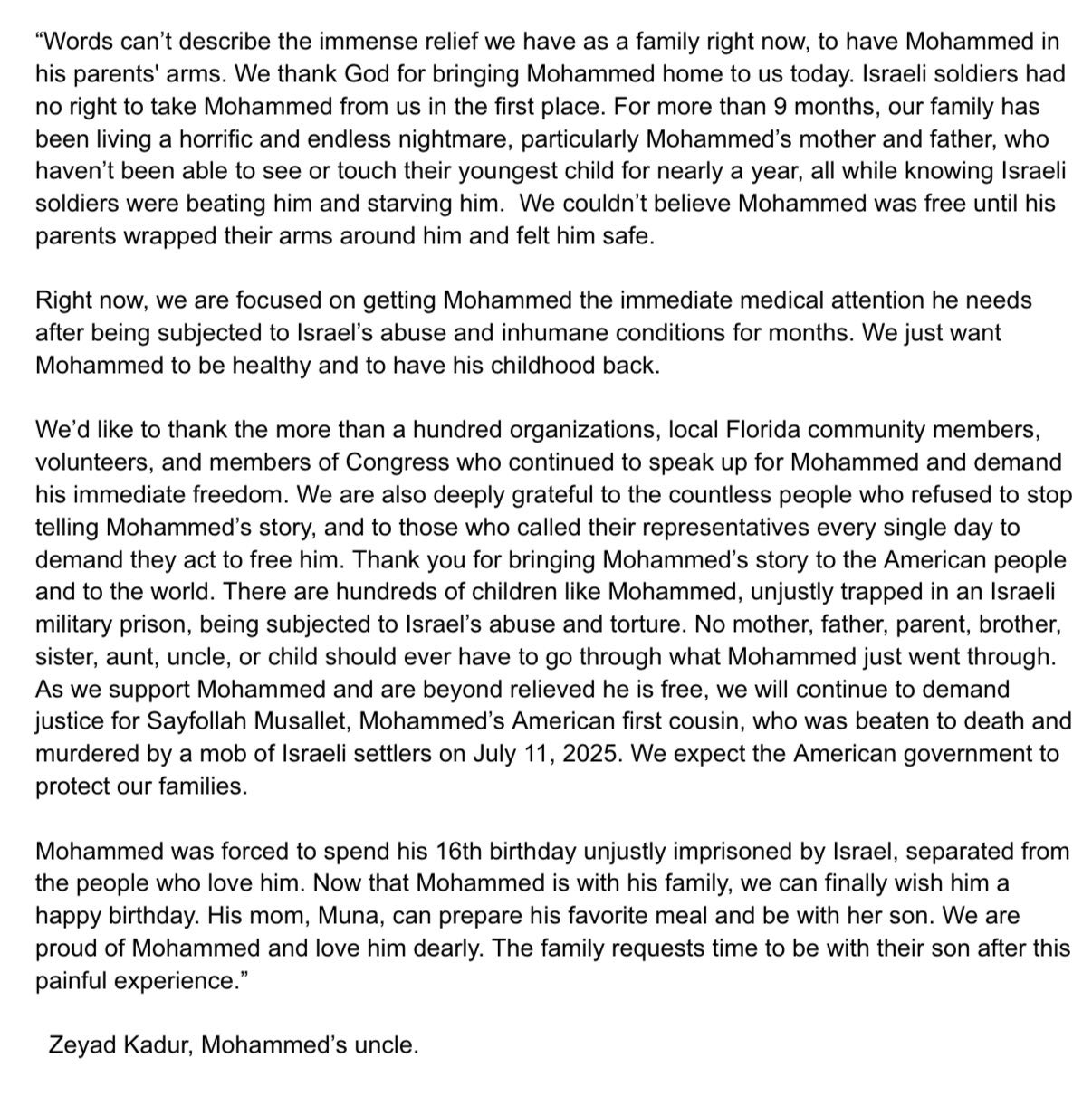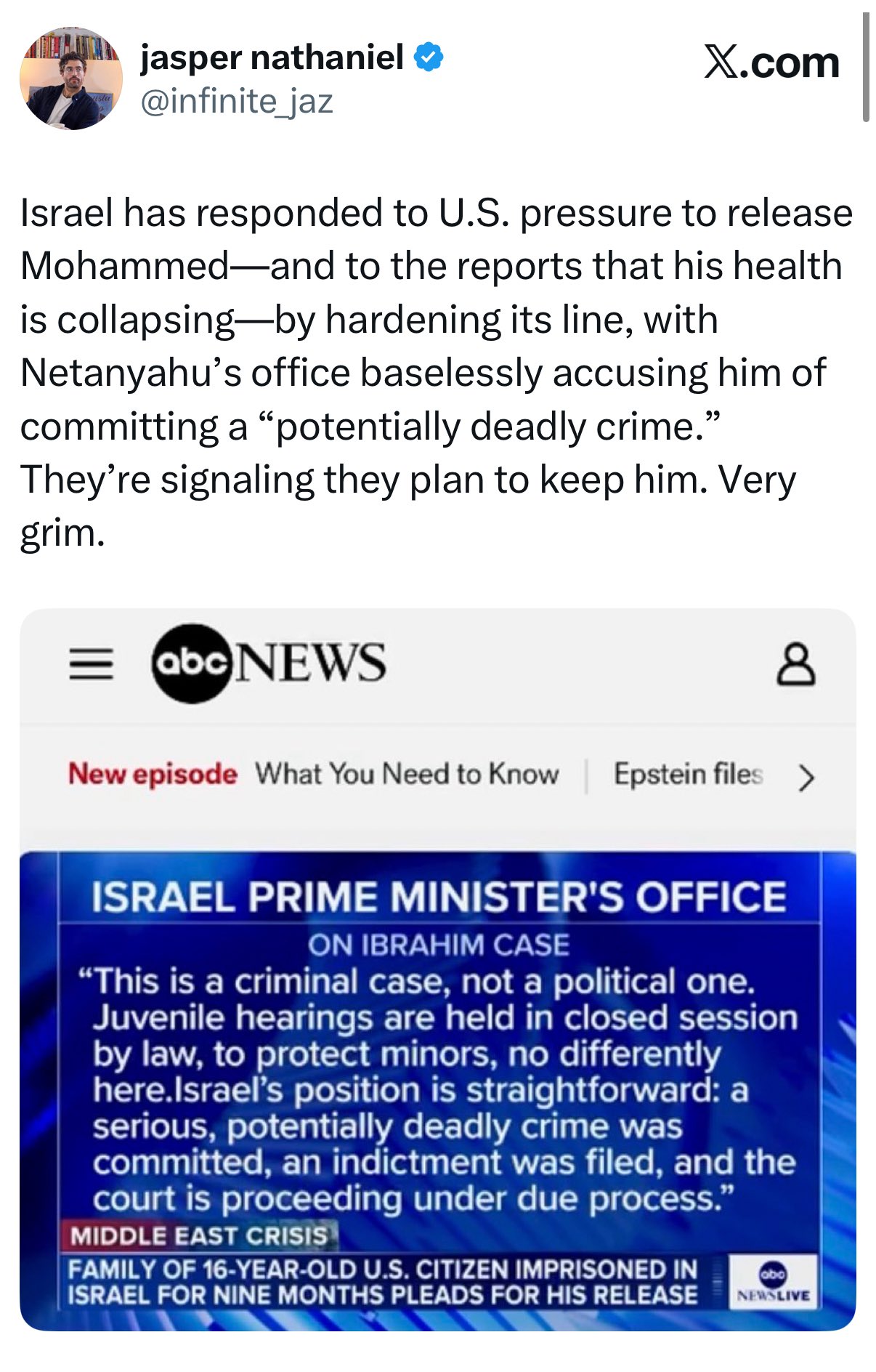 Mohammad Zaher Taysir Ibrahim, a 15-year-old Palestinian-American boy from Florida, has been illegally imprisoned by the Israeli occupation after being abducted at his family home in Al‑Mazra’a ash‑Sharqiya, near Ramallah, near Silwad on February 15, 2025. He is detained in Israel's Megiddo prison since February, accused without evidence of throwing a rock on an empty street, a charge routinely used to criminalize Palestinian youth. He’s endured inhumane conditions, lost over 25 pounds, and contracted scabies. His health has severely decline and his family fears for his life, as other prisoners have died from torture, disease, and starvation. Despite their pleas, major U.S. media outlets have ignored the case.
