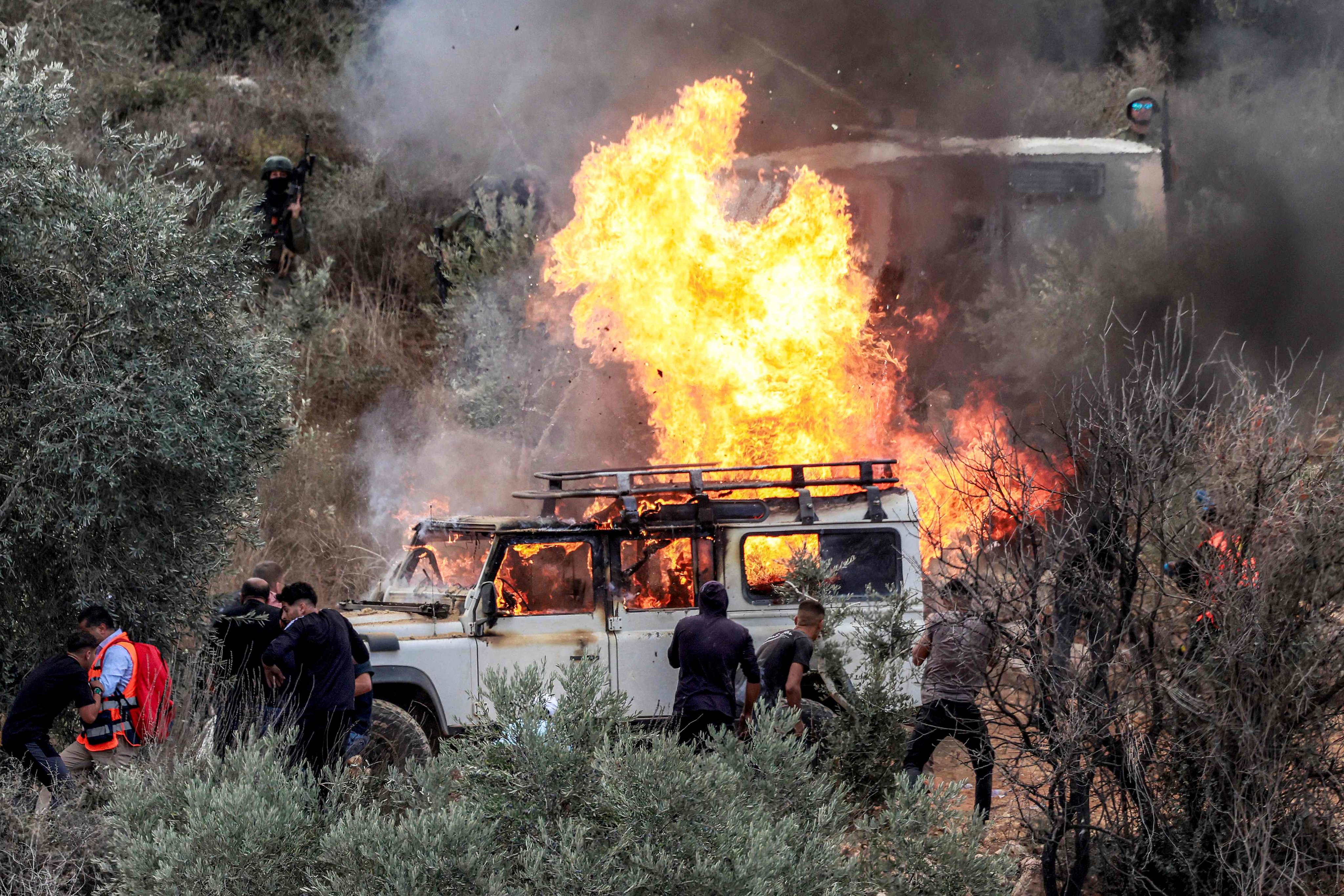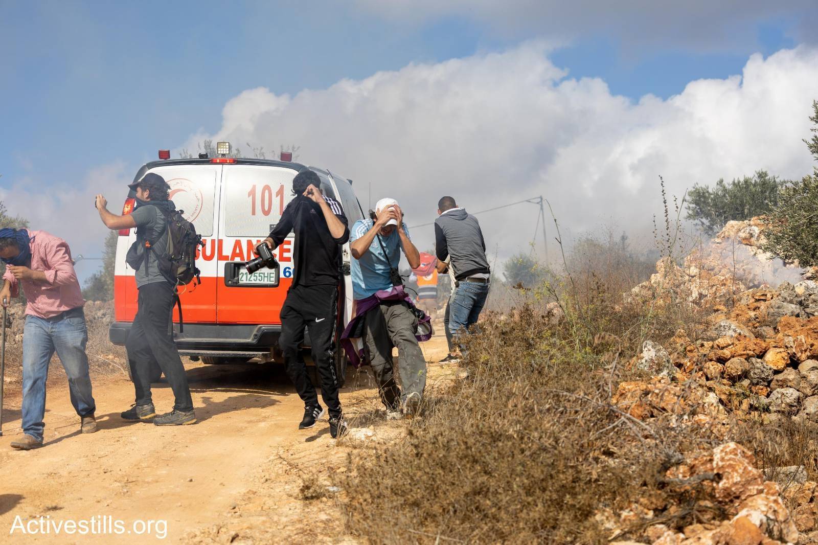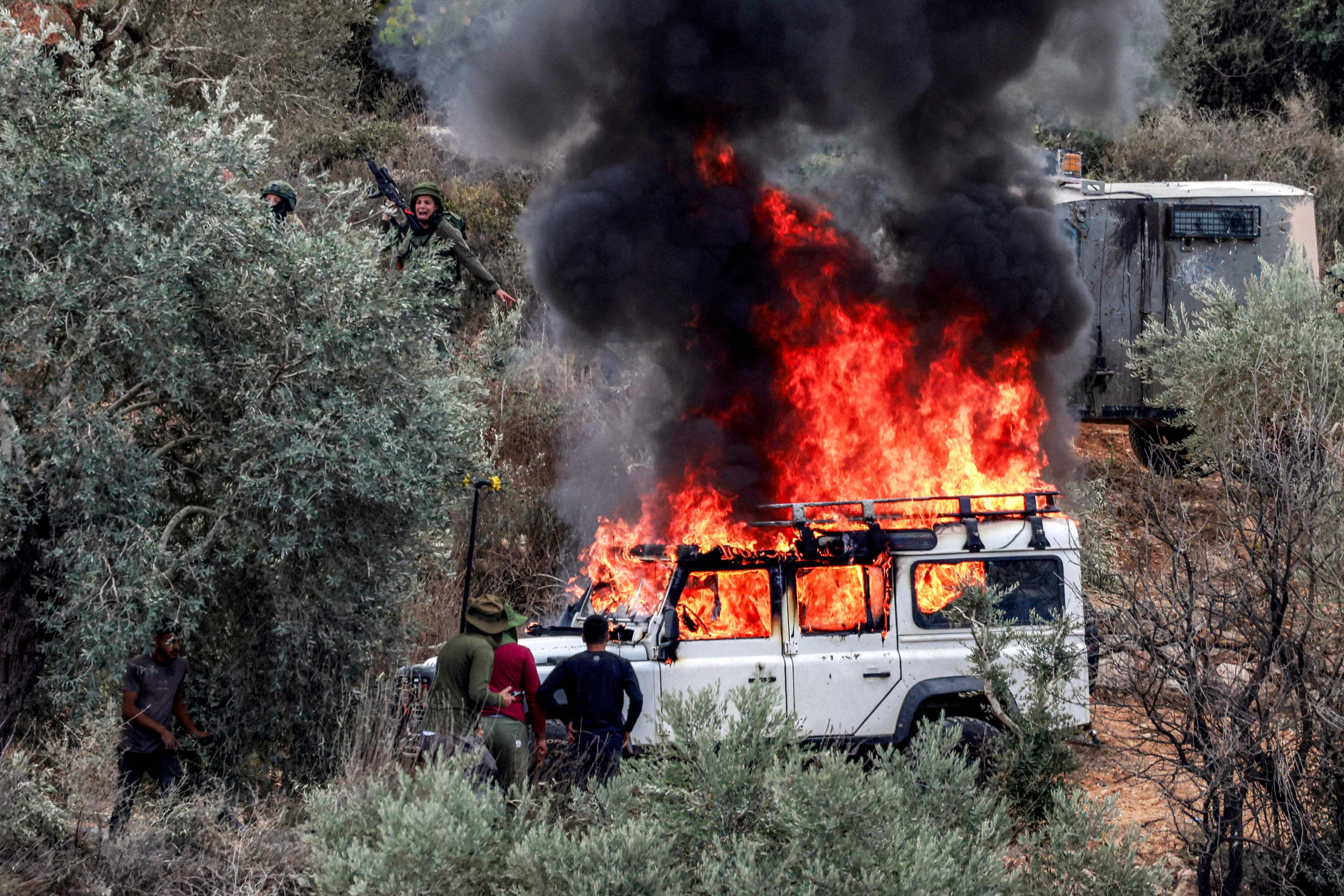 Suddenly,* “dozens of masked settlers descended upon the harvesters and attacked them with clubs and stones.”* A Palestinian Jeep was torched, and Ashtiyeh’s own car was also destroyed. As he fled, “they pelted him with stones,” and he was injured.