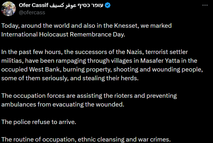 "Today, around the world and also in the Knesset, we marked International Holocaust Remembrance Day. In the past few hours, the successors of the Nazis, terrorist settler militias, have been rampaging through villages in Masafer Yatta in the occupied West Bank, burning property, shooting and wounding people, some of them seriously, and stealing their herds. The occupation forces are assisting the rioters and preventing ambulances from evacuating the wounded. The police refuse to arrive. The routine of occupation, ethnic cleansing and war crimes."