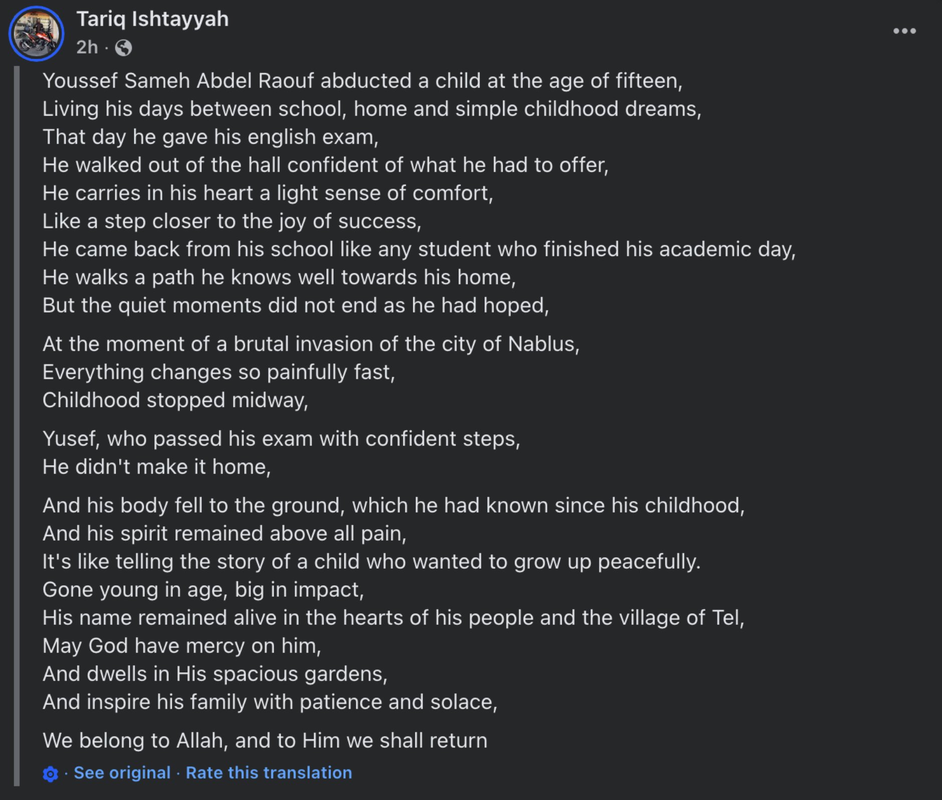 “Through your martyrdom you have attained the highest degrees. May God have mercy on you and grant you eternal peace in paradise” That’s what Teacher Ahmed Attallah wrote on the English exam his student Yousef Ishtayeh completed hours before the israeli soldiers murdered him.